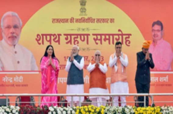 Jaipur, Dec 15 : Bhajan Lal Sharma on Friday took oath as the 14th Chief Minister of Rajasthan. Along with him, two Deputy CMs -- Diya Kumari and Dr. Premchand Bairwa -- also took oath in the presence of Prime Minister Narendra Modi, Union Home Minister Amit Shah, and other senior leaders.