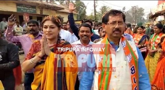 BJP’ Bishalgarh candidate Nitai Chowdhury, leader Anjan Puro kayasto also accompanied Rupa Ganguli during the rally at Bishalgarh New Market.