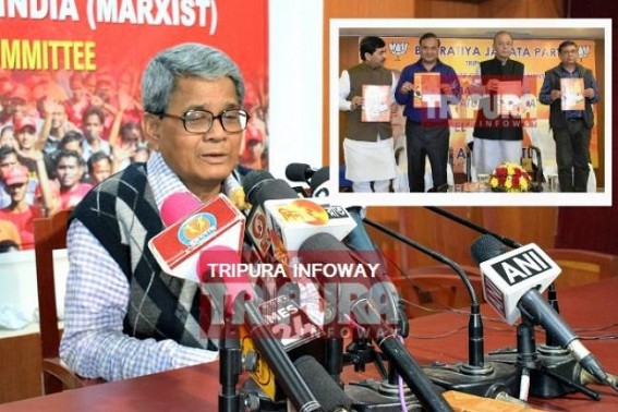 AGARTALA, Feb 11 (TIWN): After BJP had released its election manifesto, hitting upon BJP's promises of smart-phone 'gifts' to youths after BJP in power, CPI-M State Secretary Bijan Dhar said, "Don't know to whom they are allocating business. May be Jio. However, at the beginning (of Digital era) it would be nice but now all have smart phone. So, gifting of smart-phones will not bring much effects among the youngsters votebanks". Talking about other election promises of BJP, Dhar said, "Earlier also we heard many times from anti-CPI-M parties that every families will get a job and thus BJP has kept a similar promise on the top-list. The strategy of providinging each families with job has not been adopted in any state of India, rather under the Central Govt at least 40 lakhs of vacancies are yet left without filling up".