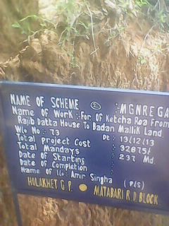 The investigating team visited three villages in Holakhet Panchayat under MataBari Block. What the team found? In as many as five places signboards of 'Completion ' of developments projects are seen but literally not a single paisa was spent in any of these places. All these signboards are installed in the midst of jungles and bushes or in such places where no man could have trod on at least for the last two years. The projects of which signboards have been installed are all under MGNREGA during the year 2013.