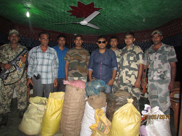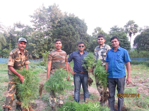 The first raid was carried out under the leadership of the Dy. Commandant of 29 Battalion BSF, P.C. Suraj, assisted by R. K. Mishra and Anil Ranwa, Coy Commanders of Dhanpur and Nirbhoypur BSF BOPs respectively. Acting on a tip off, the BSF team raided a shop owned by one Samir Saha in Sonamura market and recovered 3.32335 lakh Bangladeshi Currency. Besides, 8.23100 lakh Indian currency was also found alongside the Bangladeshi currency, from which it can be presumed that the Indian currency was kept in the shop for being exchanged with Bangladeshi currency. The seized currencies were then handed over to the local Customs authorities. The raid lasted for about one hour, between 12 noon and 1 p.m. Thereafter, in another successful and meticulously planned raid, sound-crackers worth Rs.29.50 lakh was recovered from Rabindranagar market. A particular shop in the market owned by Mohan Miah was raided, and huge amounts of sound-crackers were recovered from an underground chamber. The raid spanned for about half-an-hour, between 3 pm and 3.30 pm. Possibly, this was the largest seizure of sound-crackers in a single day anywhere in the state. It may be mentioned that Hon’ble High Court of Tripura and the Tripura Pollution Control Board had imposed severe strictures and prohibitory orders on storage and sale of such sound-emitting fireworks. The seized sound-crackers have been retained in the custody of the Srimantapur BSF BOP. Thereafter, in the third operation of the day, a team headed by SDM Sonamura, Subhasis Das, proceeded towards Barmura Gram Panchayat of Kathalia R D Block and there destroyed two ganja plantations which involved uprooting and seizure of 1005 ganja plants, the market value of which works out to Rs.25 lakh as per the Excise Department norms, considering the yield from each plant to be 500 grams. The last operation of the day was carried out between 5 pm and 5.30 pm, during which a team headed by the SDM Sonamura recovered 110 kg of dried ganja from an abandoned place in the vicinity of Machima market of Sonamura. The market value of the recovered dried ganja is estimated to be Rs.5.55 lakh. The seized ganja has been kept in the custody of Dhanpur BSF BOP.