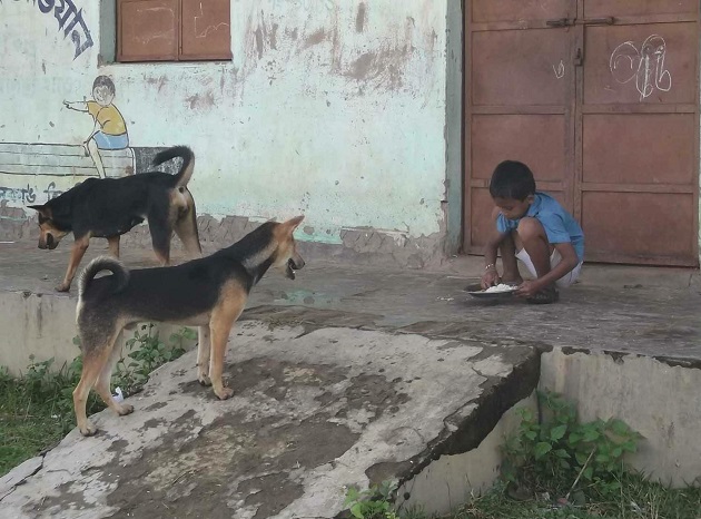 Picture : Bhanukar Bari SB school under Korbook sub division, students having midday meals in front of dogs