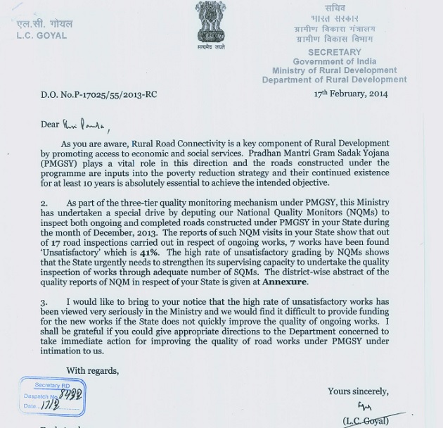 AGARTALA, October 18 (TIWN): Tripura has been claiming to have been awarded by the Centre as Number 1 state in implementing various centrally sponsored funds properly. But under PMGSY sector Tripura was warned during the its ' Friend UPA Govt's tenure. However, as expected no reply was given from the state in this regard. On 17th February 2014 a letter was sent to Chief Secretary S K Panda by L C Goyal , Secretary of Government of India , Ministry of Rural Development. In this letter vide D.O.No.P-17025/55/2013-RC L C Goyal( Despatch no 8322, date 17/2) alleged high rate of unsatisfactory grading given by National Quality Monitors(NQMs) regarding the ongoing and completed construction of roads under Pradhan Mantri Gram in Sadak Yojana(PMGSY).