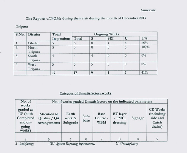 In Dhalai District the NQM visited 5 works and 4 was found unsatisfactory while in North Tripura the NQM visited 3 ongoing works and all 3 were rated as unsatisfactory( respectively 80% and 100%). Mysteriously S K Panda did not give any reply to the Centre on this issue. On 23rd April 2014 Director, Ministry of Rural Development , Deott. Of Rural Development , Govt of India P. Manoj Kumar sent another letter to Shri G Kameswara Rao , Addl Chief-Secretary(Public Works Department), Govt of Tripura under same D.O.No.P-17025/55/2013-RC stating :-