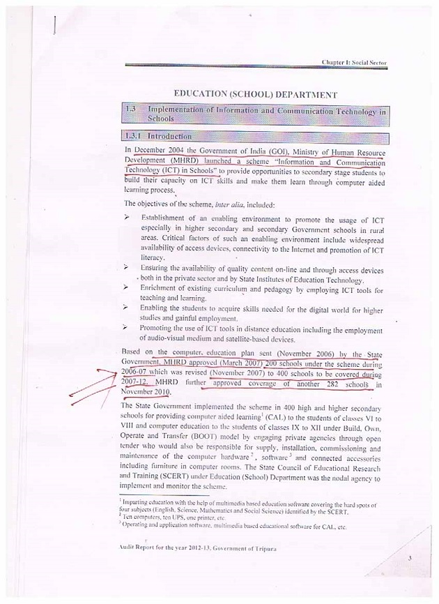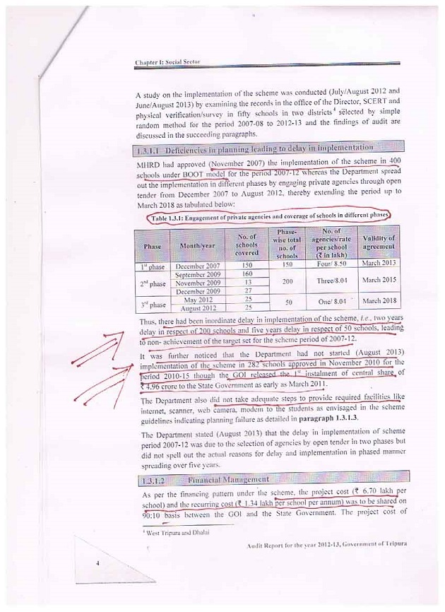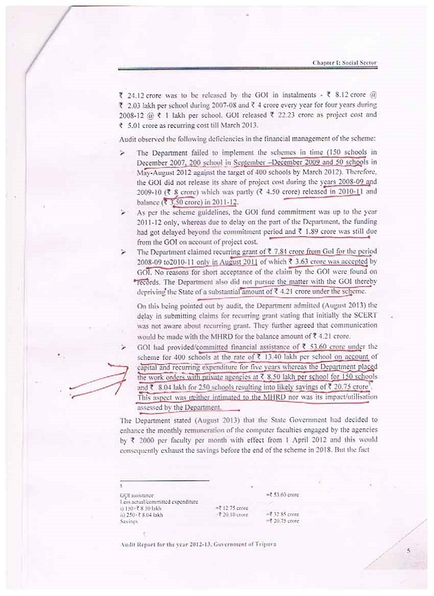 AGARTALA / KAMALPUR, October 27 (TIWN) : The report of the Comptroller and Auditor General (CAG) of India, found massive irregularities and unwarranted delay in the scheme of imparting ‘Information and Communication’ education to the school children. This fact has come out in the report of the CAG ( Report 1of Govt. of Tripura, 2014) brought out after auditing for the fiscal 2012-13.The Government of India provided financial assistance of 53.60 crore rupees for 400 schools at an average of 13.40 lakhs per school. But the School Education Department provided the private agencies a rate of 8.50 lakhs per school for 150 schools and 8.04 lakhs per school for 250 schools. The report claims that, this resulted into “ a savings of 20.75 crores.†More seriously, this matter was neither intimated to the Ministry of Human Resource Development Department, Govt. of India nor was its impact or utilization assessed by the Department. Now the question is, what was done with this Rs 20.75 crores unaccounted money ? The report also notices the department’s delay in implementation of the scheme in 282 schools approved I November 2010 for the period 2010-15. Not only delay in implementation, but the CAG report shows , how the School Education Department vanished crores of rupees by providing the agencies less than Central Govt. fixed rate.