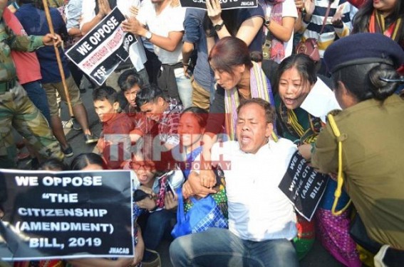 AGARTALA, Dec 11 (TIWN): Anti-CAB agitators who are observing Strike since last 3 days have announced to continue stir till Govt of India withdraws the controversial Citizenship Amendment Bill (CAB) or calls all the regional party leaders under Joint movement to exchange dialogues. Today a massive protest was staged before the Astabal stadium, blocking road and police have arrested around 300 picketers from the place. No violence was conducted by stone pelting in a vehicle by one of the agitators has broken a police vehicle’s glass. The “Joint Movement†sought dialogue exchange with the Government where all regional parties to remain present.Regional parties led “Joint Movement†committee blocked road today in Agartala and many other places across Tripura, whereas in Agartala over 300 picketers were arrested by police.