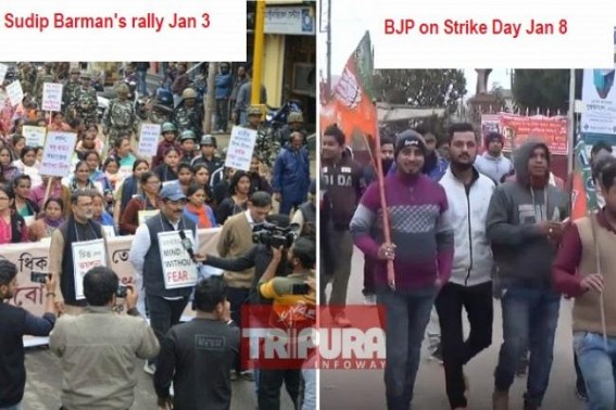 AGARTALA, Jan 9 (TIWN): Jan 8’s successful strike exposed BJP’s decaying support in Tripura as public venting in resentments. In an irony of Modi era, top leaders including MP(via rigging) Pratima came on road to beg people to open their shops, entered banks and post office forcing for while to call off the strike. However, mid BJP led forcefulness and threatening, public response to the strike remained open and the strike called by trade unions became 100% successful, although after 12 noon, BJP started threatening to open shutters of shops but still strike continued with massive response. Public didn’t come out of houses, although Govt employees were forced by warning to join offices.CPI-M activists blocked railway in ADC and other areas and train services remained paralyzed for long. Due to lack of passengers other transport services were equally hampered.