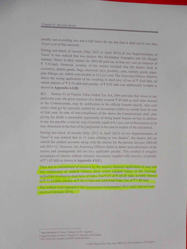 KAMALPUR, November 7 (TIWN) : The inefficiency of the Officials has caused a great loss to the revenue collection of the State Govt. during 2004-05 to 2012-13 in Sales tax, Vat Tax, leviable interest, penalty and Aditional Sales Tax amounting a total loss of 1,51,3800. The loss in Sales Tax /VAT Tax is 60,30000 rupees ; in leviable interest 51,16,000 rupees; in penalty 38,12,000 rupees and in Additional Tax 1,80,000 rupees. All these facts has revealed in the report of CAG (Report 1 of 2014 of Govt. of Tripura).In the report, the CAG summed up that “ concealment of turnover by the dealers, incorrect application of rates and non submission of audited balance sheet which escaped notice of the assessing authorities resulted in short levy of Sales Tax/ VAT of 60.30 lakh, leviable interest interest of 51.16 lakh, penalty of 38.12 lakh and Additional Sales Tax of 1.80 lakh.â€