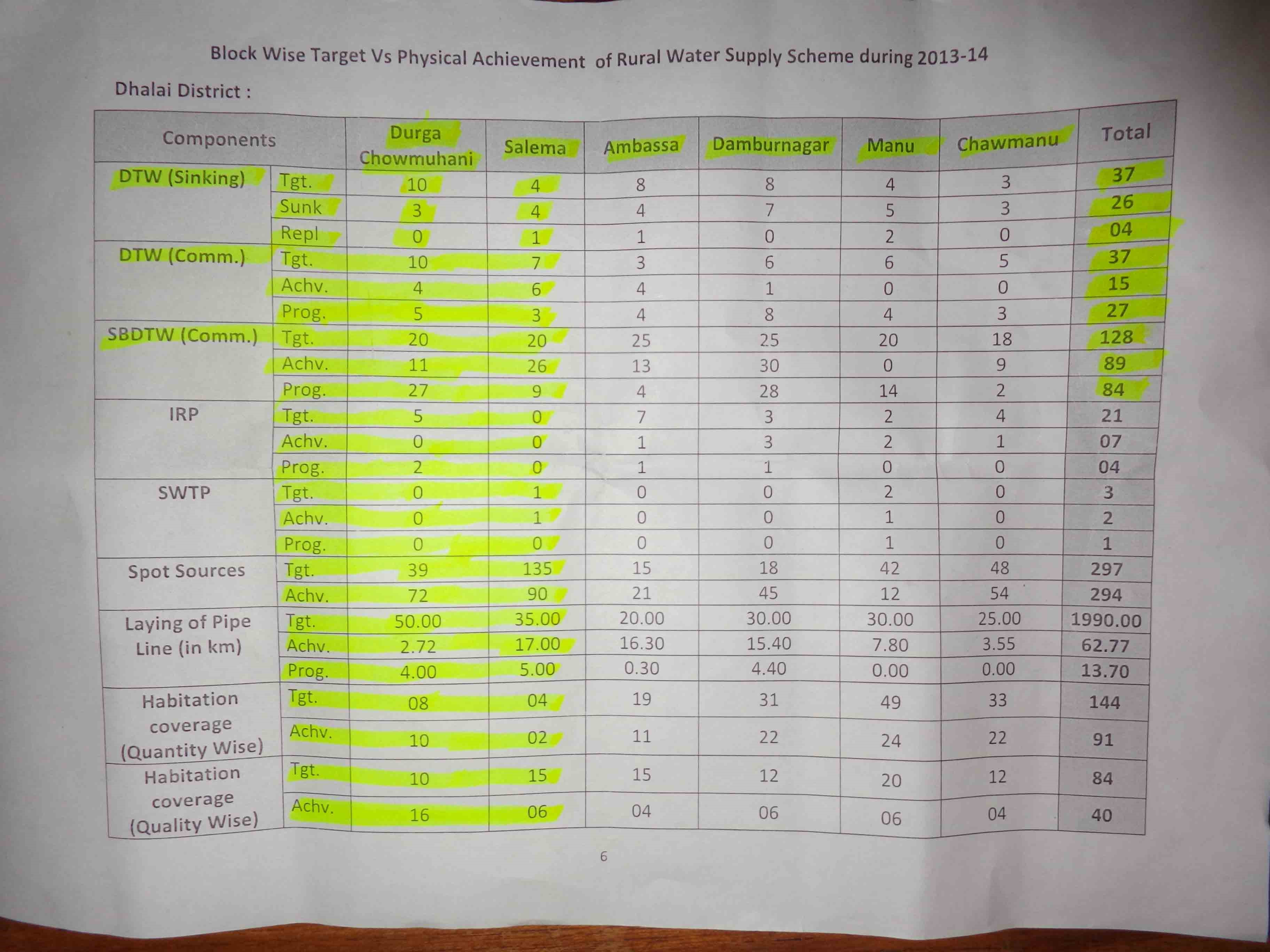 According to the report, the extension of pipeline for drinking water is the most poor sector. In the Durgachowmuhani Block the target of laying pipeline was set for 50 kms and actually the division achieved only 2.72 kms and more 4 kms was shown as under progress. In the case of Salema Block, 17 kms was achieved from the target of 35 kms and 5 kms more under progress. In case of DTW ( Deep Tube Well) sinking, under Durgachowmuhani Block 3 were sunken against the target of 10 and in the Salema Block 4 was sunken against target of 4 and 1 was shown replaced. In the commissioning of DTW 4 was achieved out of targeted 10 and 5 were in progress under Durgachowmuhani Block. In Salema Block, 6 out of 7 was commissioned and 3 were in progress.