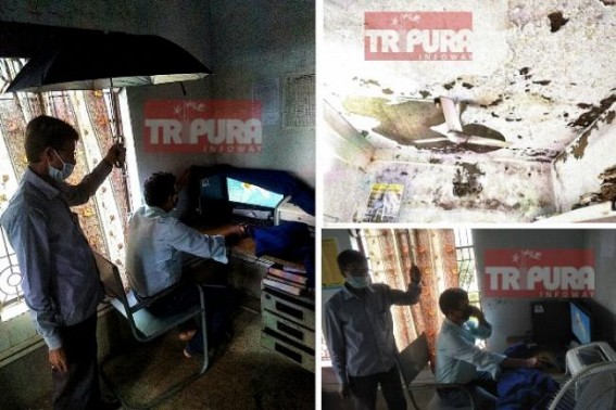JOLAIBARI (SANTIRBAZAR), July 13 (TIWN): Tripura never witnessed such worst era in its history where State Govt employees are working with umbrellas inside offices on their computers to save themselves from rain leaked office buildings. In Jolaibari, Santirbazar sub-division, State Electricity Department office building was never repaired after BJP came into power since 28 months, as a result rain pours into building, every official use umbrella to cover themselves & their computers. BJP Govt's tall claims from 5.5 Lakhs employment in 2 years to 'Ek Tripura, Sherstha Tripura' all turning as JUMLA as State is lagging development from all sides. For 3 years this building had no maintenance, caused such consequences.
