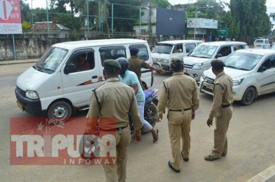 AGARTALA, July 30 (TIWN): As 3 days long Lockdown has been now extended till 4th August, 5 AM, Police have continued checking of vehicles and goers. Apart from emergency services and essential commodities, the whole Tripura on Thursday remained paralyzed due to ‘Total Lockdown’. Lockdown in Tripura has started from Monday 5 AM to be continued till 4th August 5 AM. Govt and Police have requested the people to stay home as much as possible. Vehicle Services were crippled, but Govt’s emergency services like hospitals, ambulances remained open without any pause. Public gave massive response to the Lockdown and no gathering or crowd was seen at any corner. Today, from morning police were on duty to keep people in home and also many came under actions. With the Paralyzed Transport system on Thursday, vehicle movements were halted as restrictions are now imposed strictly for the "Total Lockdown".