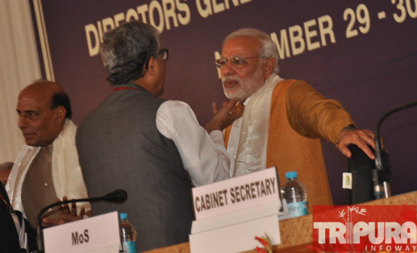 PM Narendra Modi speaking to Tripura CM Manik Sarkar at Guwahati DGP conference. TIWN Pic Nov 30