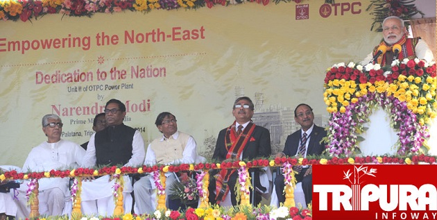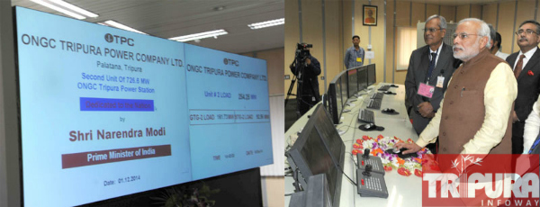 OTPC PLANT, PALATANA, December 1 (TIWN): Prime Minister Narendra Modi has officially dedicated the Unit-II of ONGC Tripura Power Company Ltd(OTPC) 726.6MW to the nation at around 2.42pm here in Palatana. With this after a long journey of 9 years Trilura virtually steps in India as the 2nd Surus state in the country after Sikkim. Prime Minister Narendra Modi arrived at Agartala Airport by IAF BBJ at around 1352HRS and from there he came to Palatana by Z3040 helicopter. Soon after arriving at Palatana Helipad Prime Minister dedicated the Unit-II(363.3) of OTPCs plant at 2.42pm in presence of Governor of Tripura P B Acharya, Chief Minister Manik Sarkar , Minister of State(Independent Charge) Dharmendra Pradhan Tripura Power Minister Manik Dey ,BHEL, IL&FS CMDs and ONGC full Board of Directors .