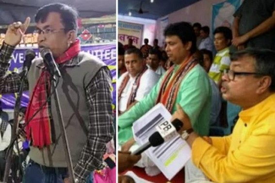 AGARTALA, Dec 19 (TIWN): Tripura Education Minister Ratanlal Nath who on yesterday has labeled 10323 teachers as CPI-M cadres by calling the agitating teachers' protest as CPI-M's protest, teacher Ajay Debbarma while addressing in 'Joint Movement Committee' dais infront of City Centre today evening gave the Minister a befitting reply asking what happened to all these ethic and lectures of the so called Cabinet Ministers before the Election and what led them to sit SSA's protest in 2017 but now after winning election, they are hiding their faces from 10323 teachers protest ? This statement came when the BJP CM, Ministers are acting like so much ethical to the rules and regulations after using the 10323 teachers and various Govt employees as vote bank policy before 2018 election through their fake-promises.