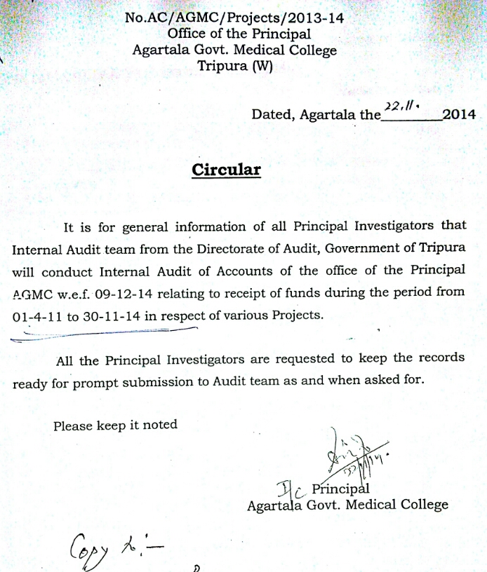 AGARTALA, Dec 7 (TIWN):Following a RTI by the Tripura State Congress Spokesperson Dr Ashok Sinha to the Principal, AGMC to find about grant and expenditure details of all research projects of AGMC sanctioned by different central departments & agencies during last 3 yrs, a detailed internal audit has been ordered by the Dept of Audit, Govt of Tripura to fix all the possible loopholes.