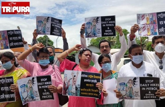 AGARTALA, June 11 (TIWN): Congress on Friday has staged protest against hiked fuel prices nationwide, which is affecting Tripura. The party had asked the State Govt also to reduce VAT so that people get some relieves. Petrol price which has already hit near 100 rupees is causing commodity prices in all spheres. The Congress agitators raised question, when international prices of oil are less, why it is charged high in this country ? Fuel prices have been soaring since the beginning of May. In big cities, the situation is more critical. State-run companies resumed daily revisions on May 4 after an over 18-day halt. Since then, petrol price has risen by over Rs 6 per litre. Diesel prices have also witnessed a sharp increase in last one month. In Mumbai, a litre of diesel is being sold at ₹94.15 for a litre. Diesel price has climbed to Rs 86.75 for a litre in Delhi on Friday.