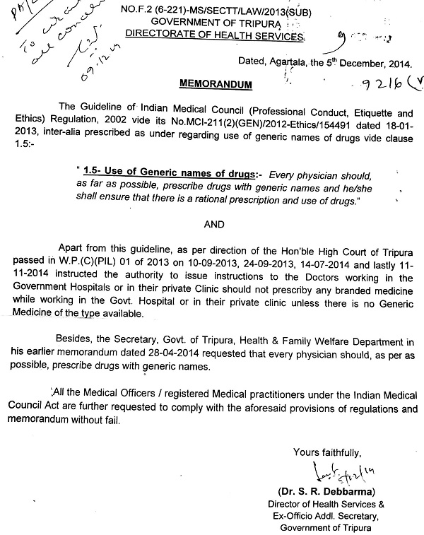 Apart from this guideline, the High Court of Tripura on WP(C) (PIL) 01 of 2013 on September 10 and 24, 2013, July 14, 2014 and lastly on November 11, 2014 instructed the concerned authority to issue instructions to the doctors working in the government hospitals or in their private clinic unless there is no generic drug of the type available.
