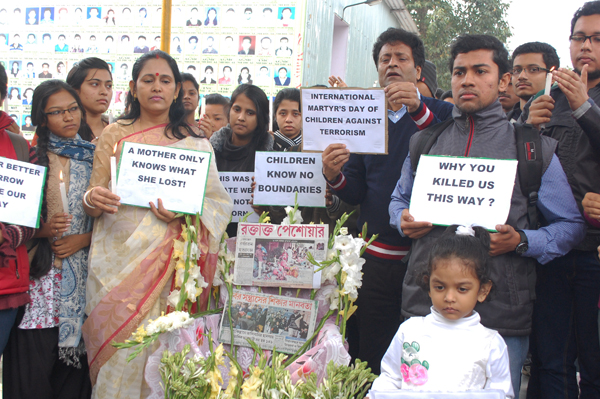 They offered floral tributes to the departed soul of their brothers and observed a two minute long silence. Holding placards that protested and condemned the brutal act, the students sought declaration of the 16th December as International Martyr’s Day of children Against Terrorism by United Nations.