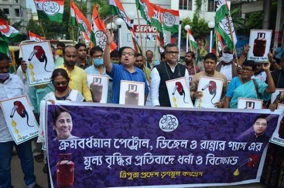 AGARTALA, Oct 26 (TIWN): Trinamool party has staged a protest in Agartala over fuel price and daily commodity price hikes. Taking a dig at the Modi Govt, TMC Bengal leader Kunal Ghosh said, “The people who voted for BJP and the BJP supporters must be asked whether they will get petrol at low cost if they raise the Joy-Shree-Ram slogan ? Ram is great and all Indians respect him but in the name of Ram dirty politics should be ended because this method is trying to suppress the common men’s voice. All commodities prices have massively hiked along with fuel. From Daat to Cooking gas, everything is inflationary. Poor and middle class people’s lives have turned miserable. TMC will fight for Roti-Kapra-Makan because it is the most important work right now for the people of the nation who are under tremendous suffering due to the anti-people decision of the Modi Govt. Since independence Modi Govt has broken all records of Price hikes”.