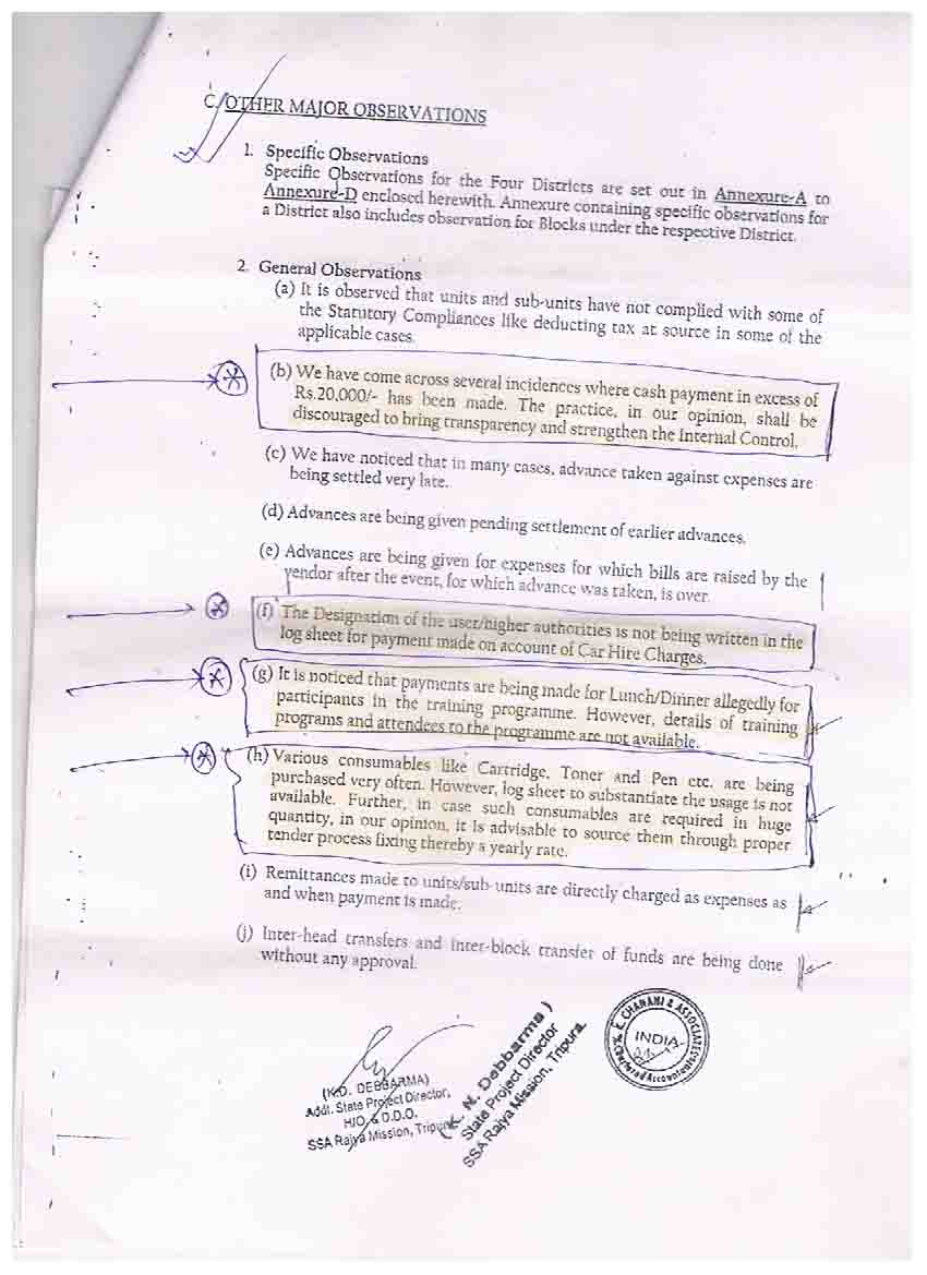 Agartala, Dec 29 (TIWN): Year 2014 brought many jolts for the hyped “Golden Era†of this state. One after another scams unearthed, close aides of ministers and party leaders even the so-called clean CM came under the scanner of law. In many cases, the police tried their best to safeguard the accused. Almost every centrally sponsored schemes and projects came under scanner. Media brought out scams reported by CAG, which were kept suppressed earlier. Now, the auditor of SSA (Sarva Siksha Abhiyaan), K. K. Chanani & Associates brought out several serious matters in the SSA for the 2012-2013 fiscal. But still no action is seen to be taken, which would surely intensify the problem.