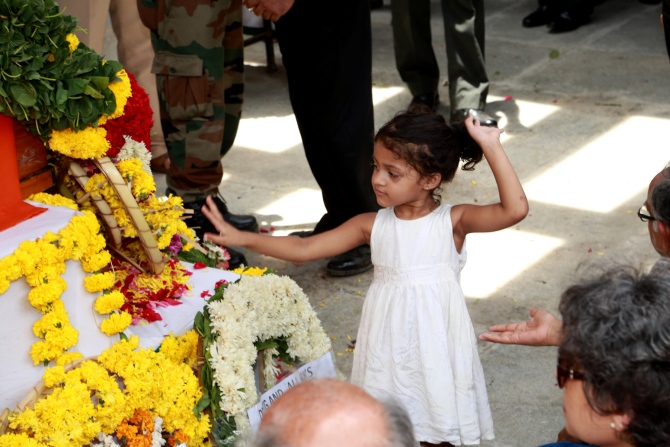 Arshea, Major Mukund Varadarajan's daughter stands near her father's coffin. File Photo