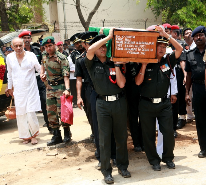 The coffin being carried inside the crematorium accompanied by the major's father father R Vardarajan . File Photo