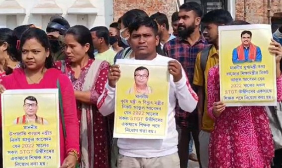 AGARTALA, Dec 23 (TIWN): STGT qualified candidates have demanded immediate recruitment amid increasing teachers’ crisis have paralyzed school education system in Tripura. Over 800 qualified TET candidates are left jobless in the state raising question over the Govt’s intention about mitigate teachers’ crisis. A protest was staged at Agartala State Museum premise by the unemployed youths on Saturday holding all cabinet ministers' photos in hands. “Earlier there was a legal barrier which was removed long back. We are unable to understand the reason behind delayed recruitment. When schools are reeling under teachers’ crisis, why can’t the Govt recruit a few numbers of qualified candidates”, said a job aspirant.