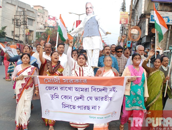 AGARTALA, February 5 (TIWN): Tripura Pradesh Congress Committee (TPCC) today staged a protest across the capital city Agartala against the BJP vision document for the Delhi elections calling the people of the North Eastern region as “immigrantsâ€, Congress with various wings and groups burning effigies of Prime Minister Narendra Modi and demanding an unconditional apology from the saffron party. The congress today reacted by stating that the BJP had once again exposed its intellectual poverty about the Northeast and has once again exposed its real faces behind the mask.Talking to the media persons today during the press conference at Agartala Congress Bhawan, Senior congress leader Harekrishna Bhowmik condemned BJP’s recent vision document calling the people of the North Eastern region as “immigrants†said that the BJP has once again exposed its “negative†attitude towards the people of the NE region.