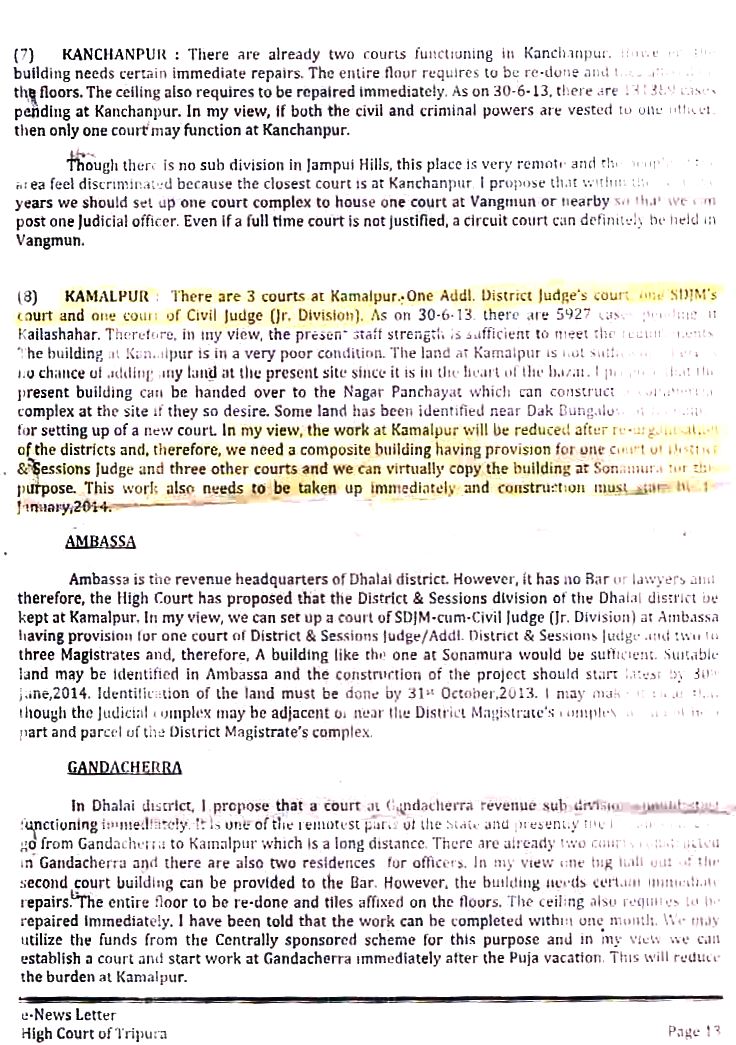 In his report the Hon’ble Chief Justice of Tripura High Court, remarked that the Court building at kamalpur was at a poor condition and the place was also insufficient. In this context, the administration selected two new sites, one near the kamalpur Govt. English Medium H.S. School and the other at Guradtilla. But the air was made heavy at the declaration of the administration that, the District court would be set up at Ambassa and even after several protests from the different strata of the society the administration not changed their decision. Now, the finalization of the site might be done tomorrow during the visit of the High Court Justice. It once again raised new hopes among the locales.