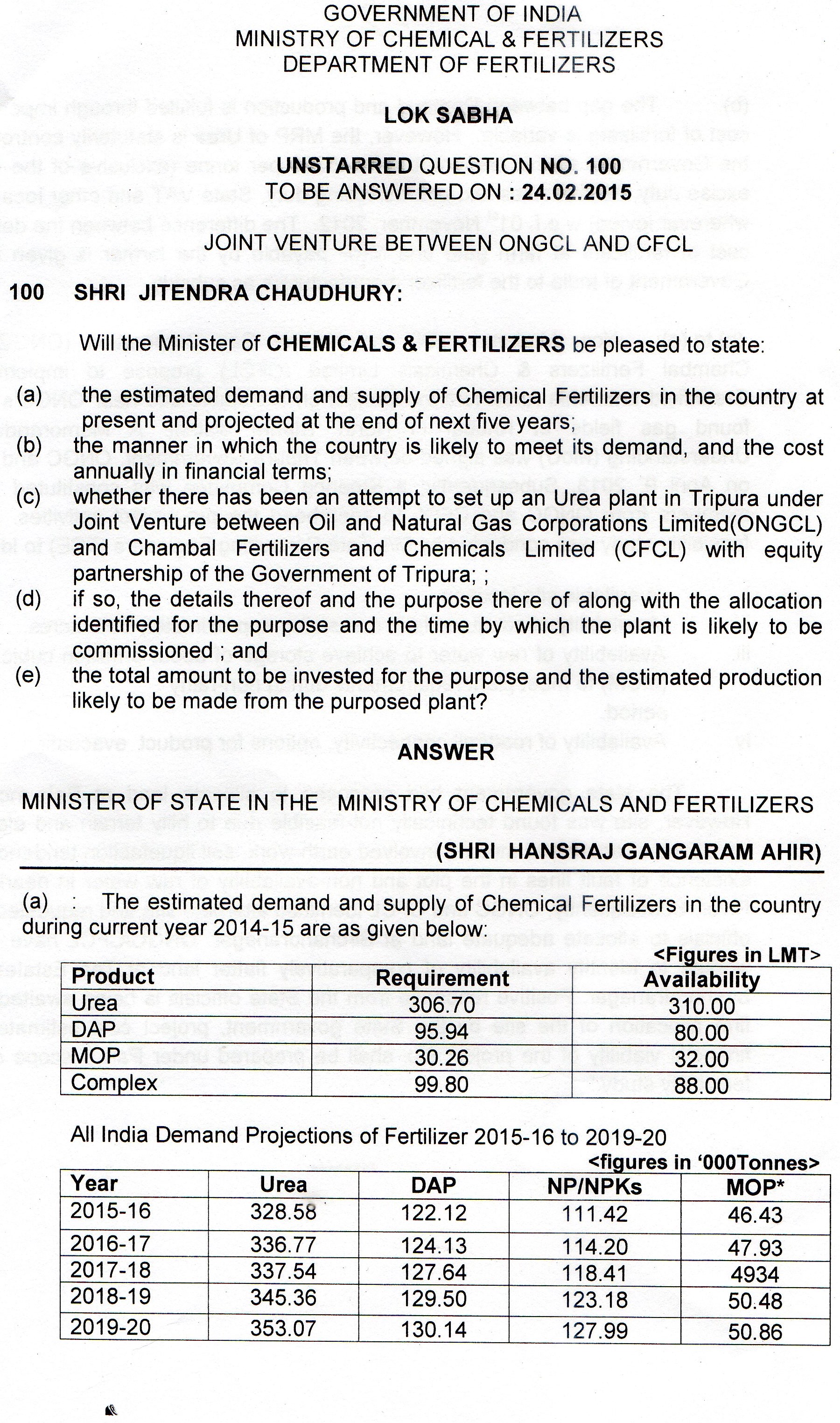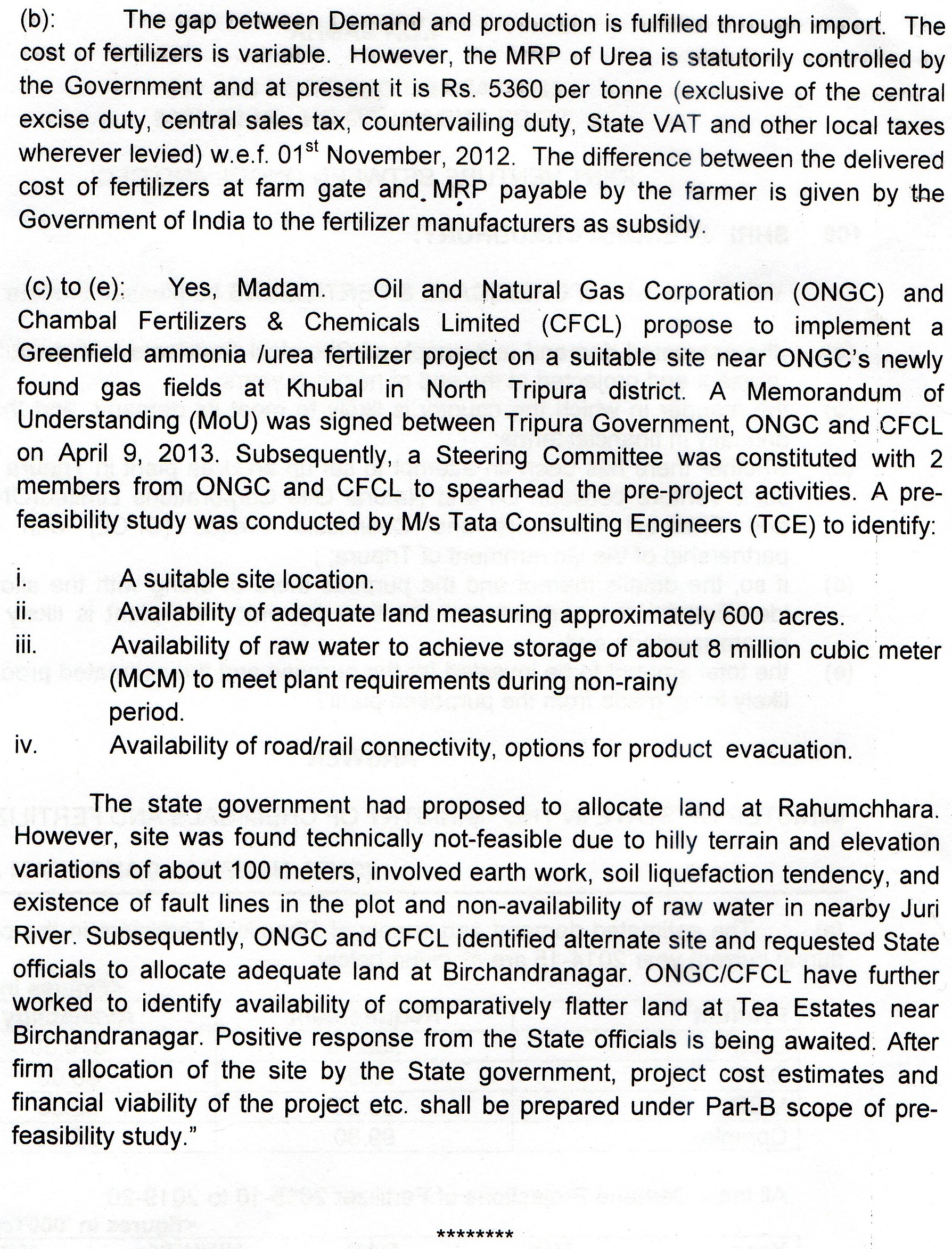 In written reply, Minister had stated that, “The State Government had proposed to allocate land at Rahumcharra. However, site was found technically not-feasible due to hilly terrain and elevation variations of about 100 metres, involved earth work, soil liquefaction tendency and existence of fault lines in the plot and non-availability of raw matter in nearby Juri River. Subsequently, ONGC and CFCL identified alternate site and requested State officials to allocate adequate land at Birchandranagar. ONGC/CFCL has further worked to identify availability of comparatively flatter land at Tea Estates near Birchandranagar. Positive response from the State Officials is being awaited. After firm allocation of the site by the State Government, project cost estimates and financial viability of the project etc shall be prepared under Part-B scope of prefeasibility study.”