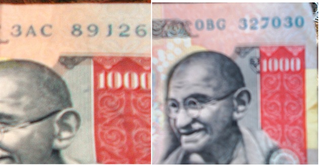 Rs. 1000 fake note on the left and bank exchanged real note on the right. TIWN Pic April 2