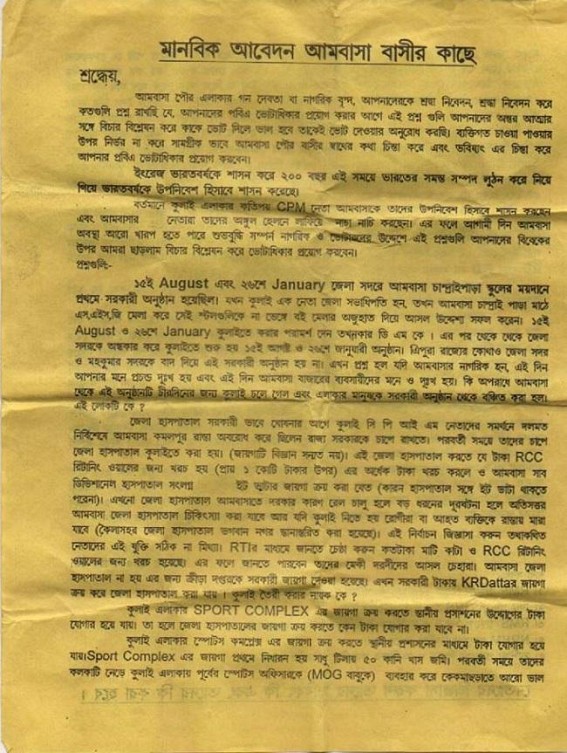 In this leaflet, the Committee alleged the CPI-M leaders for depriving Ambassa by every means. And the allegations indirectly hinted to the CPI-M District Secretary Pankaj Chakraborty who is known as highly corrupt among locales.