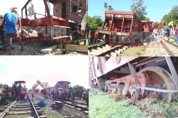 DHARMANAGAR / AGARTALA, Oct 18 (TIWN): Railway service halted in Tripura when 2 bogies had been derailed at Churaibari causing massive damages to the tracks. No life-loss although has been reported to TIWN but train service fully stopped in NE Tripura centering on Churaibari, North Tripura. Many trains are standing on the tracks including Silchar-Agartala, Agartala Silchar, Assam-Shilchar. During the passing the freight train which was coming from Lumding to Agartala was derailed, when 2 of its bogies were turned with fully loaded stones. Nothing can be said how far the track was damaged but Dharmanagar TIWN correspondent via phone reported that the mishap caused extensive damage to track due to the derailment, but work on repairing the tracks are going on in full wave. Presently with dozer, the bogies are taking out of the tacks. After getting informed, NFR officials, engineers and workers rushed to the spot and presently all are working on it, informed Dharmanagar TIWN correspondent from the spot at 3.30 PM.
