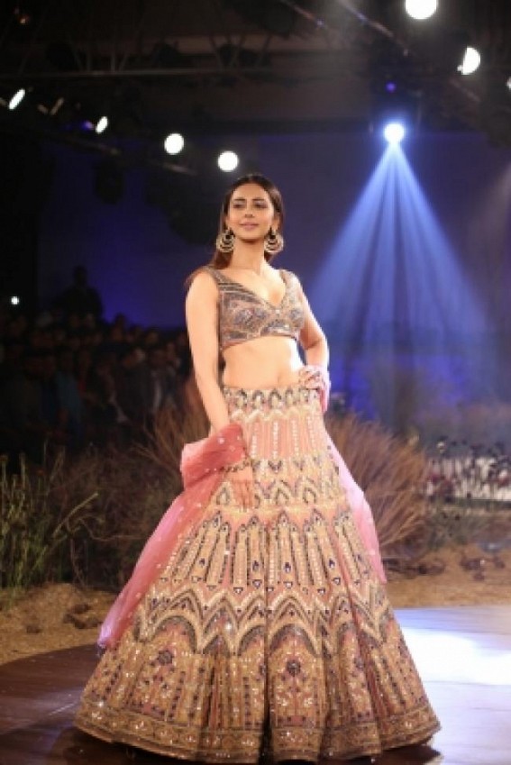 Tandon''s collection titled "The Savannah Saga", inspired by the pink sky and sunset witnessed by the designer while on a drive to Lake Tahoe in the USA, saw Indian silhouettes, presented with modern sensibilities. Actress Rakul Preet Singh closed her show, wearing a dull pink lehenga choli with resham thread embroidery and gold laser cut work. Models walked down the ramp wearing beautiful floor-length Anarkalis, gowns, lehengas with contemporary satin blouses, kurta with dhoti pants and sarees in soft hues of ivories and beige. The colour palette also included powder lilacs, old rose, mint greens. The designer has used satin and chanderi fabrics with a lot of mirror work and gold laser cuts. Nets and georgettes were also used to add a classic definition to the range.