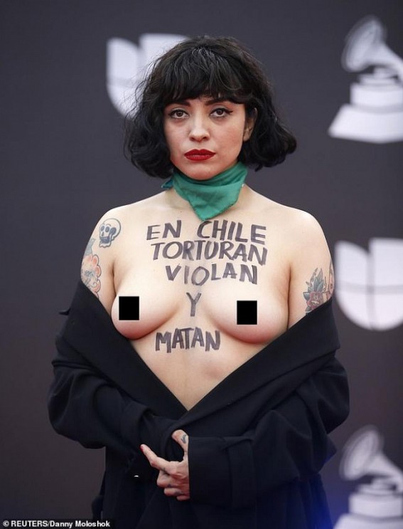 Santiago, Nov 17 (TIWN) Chilean singer Mon Laferte exposed her breasts during a broadcast of the Latin Grammys, as a show of support for anti-government demonstrators in her country. This is the latest in a line of high-profile acts of solidarity for the demonstrators.