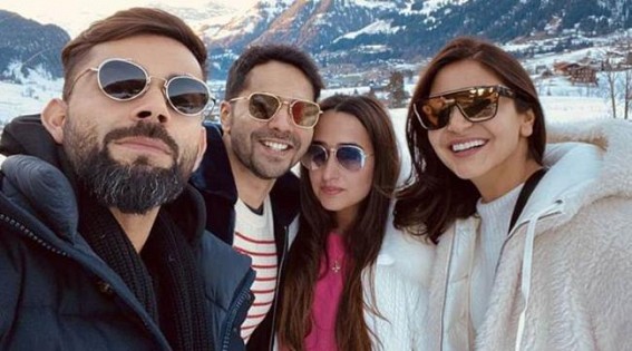 A selfie of the two couple is going viral on social media all through Monday. The pic, shared on Instagram shows the four celebrities posing happily in the white snow. "Hello frands! @varundvn @natashadalal88," Anushka wrote. Sharing the same photo, Varun captioned: "mountain ke dost @natashadalal88 @virat.kohli @anushkasharma". Not just Virat and Anuska, Varun also bumped into the Kapoor sisters Karisma and Kareena in Switzerland. Sharing a cute photo with the two sisters posing with Varun in between, Karisma Kapoor wrote on Instagram: "See who we met! @varundvn #holidayseason #snowydays".
