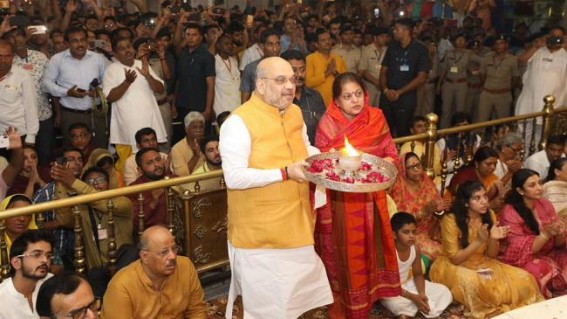 Ahmedabad, July 4 (TIWN) Union Home Minister Amit Shah, along with his wife Sonal Shah, performed the 'Mangala Aarti' on Thursday morning at the historic Jagannath Temple here, to kick-start the annual Gujarat Jagannath Rath Yatra that coincides with the Puri festival.