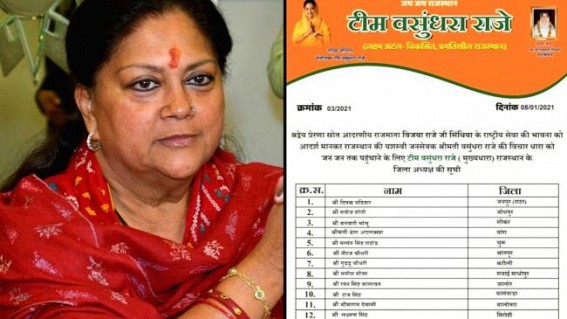 Jaipur, Jan 9 (TIWN) Shocking one and all in the BJP cadre, former Rajasthan Chief Minister Vasundhara Raje's followers have announced 25 district presidents of a solo entity 'Team Vasundhara Raje' floated in December 2020, and made the list viral on social media.