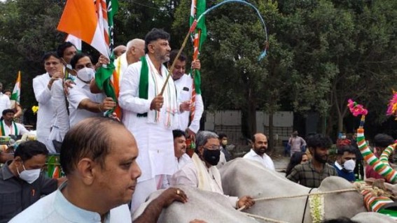Opposition leader Siddaramaiah and Karnataka Pradesh Congress Committee President D.K. Shivakumar reached the Vidhana Soudha on bullock carts with their supporters to register their protest against the rising prices of fuel and daily commodities. Traffic was thrown out of gear as hundreds of supporters and many legislators took part in the bullock cart procession.