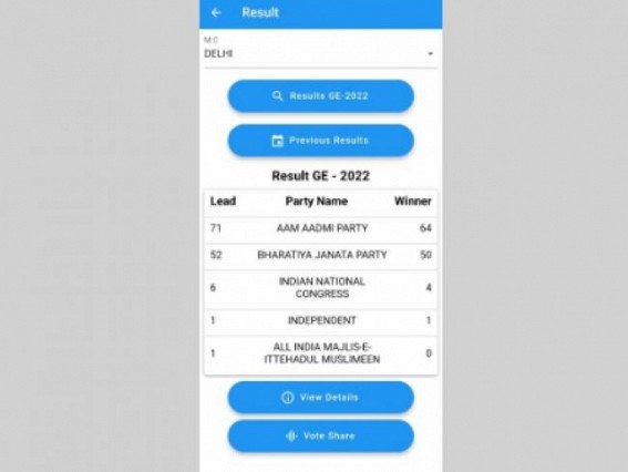 New Delhi, Dec 7 (TIWN) The Aam Aadmi Party (AAP) has won in 64 wards while BJP grabbed 50 seats as the counting is underway amid tight security in 42 centres for the December 4 Municipal Corporation of Delhi (MCD) polls.