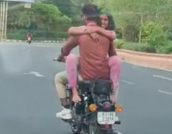 Jaipur, March 8 : Rajasthan cops are on the lookout for a couple who was seen romancing on a motorbike on Jaipur streets on the eve of Holi.