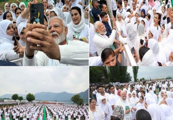 New Delhi, June 21 : Thousands of spirited Kashmir locals, motivated by the energising words of Prime Minister Narendra Modi, celebrated the 10th International Day of Yoga (IDY), on the rain-drenched ground of Sher-e-Kashmir International Convention Centre (SKICC) in Srinagar on Friday.