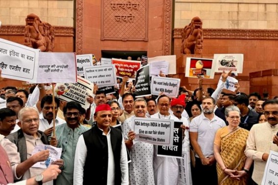New Delhi, July 24 : The opposition INDIA bloc leaders on Wednesday staged a protest in Parliament premises against the Union Budget.