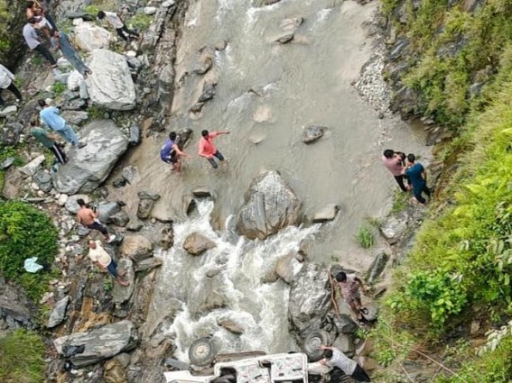 Pithoragarh (Uttarakhand), July 15 : A tragic road accident occurred in the Muwani area of Uttarakhand’s Pithoragarh district on Tuesday, when a Max vehicle carrying 13 passengers fell into a 150-metre-deep gorge.