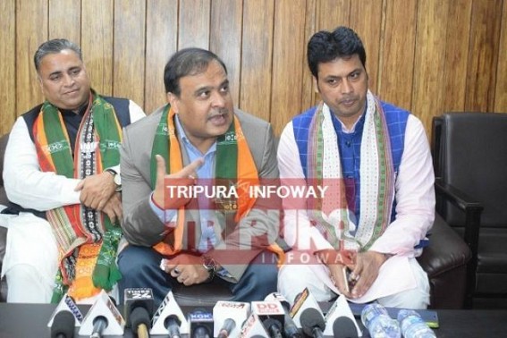 AGARTALA, Jan 25 (TIWN): Amidst CPI-M's allegations against BJP for its nexus with IPFT's Tipraland demand, BJP has announces total 9 : 51 seat sharing with IPFT, but while announcing the seats at Agartala Town Hall, Assam Minister Himata Biswa Sarma said, "BJP and IPFT will only talk on socio-economic-cultural-educational development" issues. Along with that the BJP leader also announced IPFT a member of North-East Democratic Alliance or NEDA, which is comprised of various regional parties of Northeast with the BJP. The Assam Minister said, "Our talks with IPFT regarding seat sharing issues have been completed today. Total 9 seats IPFT has taken in alliance with BJP as part of Anti-Left vote banks". The seats are : 1) Simna, 2) Mandai, 3) Takarjala, 4) Ampi Nagar, 5) Manu (South), 6) Raima Valley, 7) Ramchandraghat, 8) Asharam Bari, 9) Kanchanpur.
