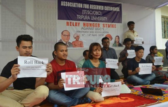 AGARTALA, April 6 (TIWN): Tension prevails at Tripura University as numbers of faculty members, research scholars have begun hunger strike from today demanding withdrawal of UGC Reservation Circular. Addressing media, the Hunger strikers said, "UGC on 5th March had issued a fresh circulation according to which, the University will not be considered anymore as a single unit. According to UGC, from now the reservation will be department-wise. But if the departments are considered as a single unit instead of the University itself as a unit, then in coming 60 - 70 years also there will be no reservation for the SC, ST, OBCs in many departments". Thus demanding withdrawal of the circulation, the scholars, teachers have sat in hunger strike which will be continued till April 14 and if their demands are not fulfilled, then in coming days there will be strike for indefinite time. It's a nationwide protest and across country's various university including Delhi, JNU, Pondicherry the strike is going on.