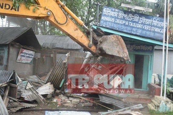 AGARTALA, May 7 (TIWN): CPI-M party offices, BJP occupied party offices and Congress party offices were demolished at the Agartala Old Motorstand area today. Some small shops were also demolished in the drive led by West DM Millind Ramteke. It was warned by West DM before 7 days to remove the party offices which have been constructed on Govt lands and accordingly the administration has taken action on Monday. Atleast 10 such party offices were bulldozed today morning and similar drives will be taken place in many other places where party offices have been constructed over govt lands. On yesterday calling a press conference, the Congress had given a strict warning not to bulldoze their party offices, whereas CPI-M asked some more time so that legally things can be checked.