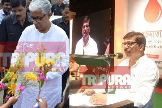 AGARTALA, June 14 (TIWN): In a rare display of cultured democratic spirit when all BJP leaders and Ministers are now badmouthing CPI-M Ex-Chief Minister Manik Sarkar, BJP Health Minister Sudip Barman on World Blood Donor Day has credited Ex-Chief Minister Manik Sarkar for his successful drive with blood donation camps in Tripura. Sudip Barman was addressing at Rabindra Bhawan, when he said this. Barman also said, Manik Sarkar should be awarded for his achievement as because of him, today blood banks of Tripura are in good shape and people are ready yo donate blood without any fear. "Encouraging people for blood donation voluntarily has been a great effort made by Manik Sarkar and I thank him for that", Barman added. Barman was addressing at Rabindra Bhawan, on the occasion of World Blood Donor Day, in the presence of School children and police officials.