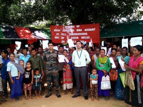 AGARTALA, July 16 (TIWN): 21 Assam Rifles as part of its endeavour to take beneficial Government Schemes to the common masses in remote areas, facilitated opening of Pradhan Mantri Jeewan Suraksha Bima Accounts alongwith SBI officials for benefit of local populace at Thandachara village in Gomati district on 16 Jul 2018 .