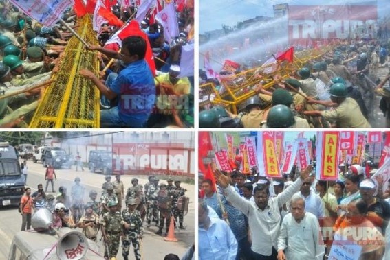 AGARTALA, Aug 9 (TIWN): Massive turnouts in CPI-M’s ‘Jail Bharo’ rally unnerved 5 months old Biplab Deb Govt as masses are expressing grudge over BJP’s misrule and cheating over pre-election bundle of JUMLA promises. Over thousands of CPI-M activists have hit Agartala streets with protest, mass agitation as a part of nation-wide ‘Jail Bharo Andolon’ on Thursday. To control the agitators police had thrown water-cannons, tear gas and dispersed the agitators. The protest rally started from Melarmath led by opposition leader Ex Chief Minister Manik Sarkar and other top leaders of State Party unit and ending the rally they gathered at Paradise Chowmuhani. Addressing the comrades, Manik Sarkar said, “Do not step into any cunning tricks, maintain the peace and return home. We’ll inform you about the next movement of usâ€. Criticizing the Modi Govt, Sarkar said, “The Govt which came in power in 2014 with hefty of promises failed to fulfill single promise. No policy has been taken for the poor people but all coming in favour of rich people".